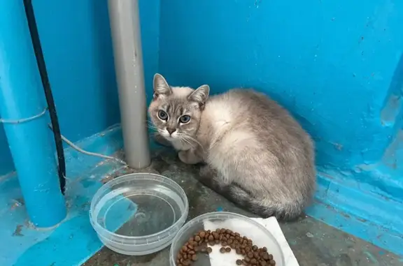 Метис, очень похожий на сиама, косенькие глазки, мордочка темная, а на носу и губах шахматный узор (темная сторона над белой губой, и с другой стороны наоборот). Белые носочки, серый хвост, на шее фиолетовый ошейник с блестюшками
