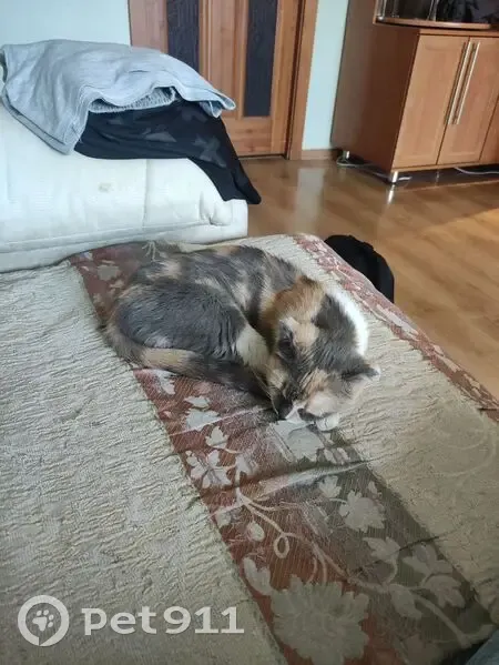 Нашли на остановке, сама подошла ко мне. Трехцветная маленькая девочка, возраст определить по неумению не смогла, худенькая, как будто давно не кормили