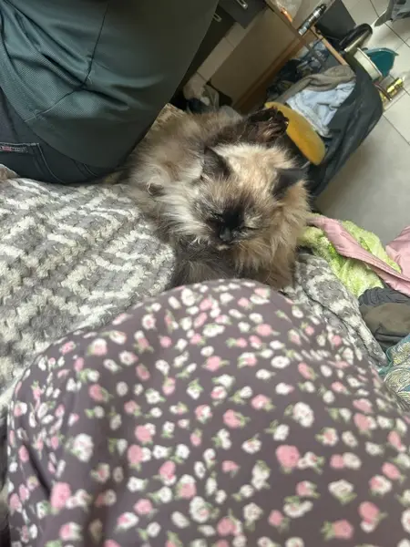 Нашли кошку. Выглядит домашней, чистая, ходит на лоток. Возможно, выскочила с балкона. Похожа на сиамскую, голубые глаза, кремового цвета, выглядит до года. Сидела в поле за домами в районе жк "Зелёный городок".