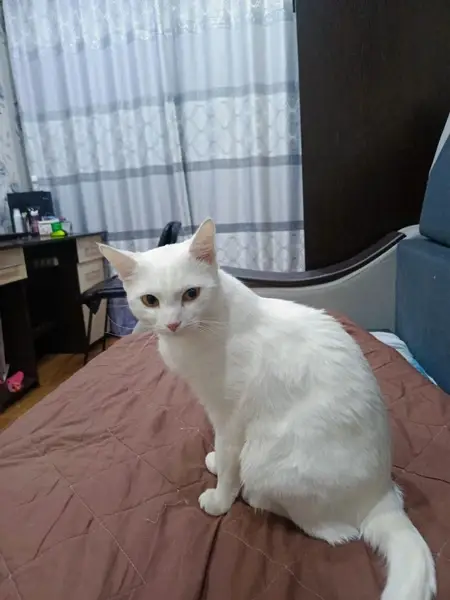 Кошечка увязалась за нами после того как мы ее погладили, выглядит ухоженно, белая шерстка и желтые глазки, может даже породистая