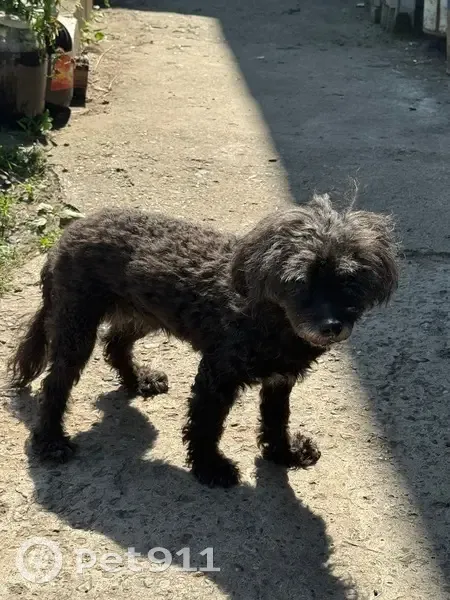 Чёрная собачка. Предположительно карликовый пудель, истощена, еле стояла на лапах, видно что давно без еды и воды, домашняя, стриженная.