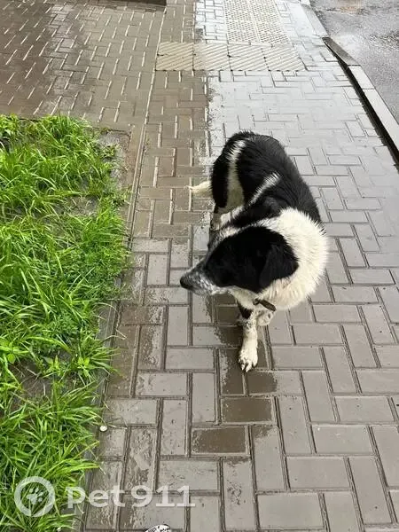 Белый с черными пятнами, с ошейником. Очень дружелюбный.