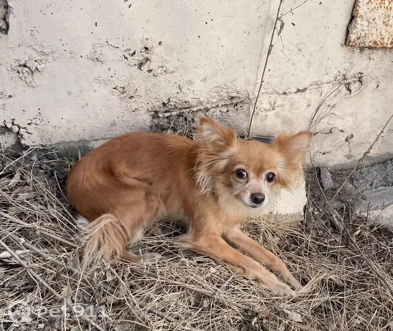 Рыжий кобелёк, похож на русского той-терьера или длинношёрстного чихуахуа, сидел в углу газона в конце парковки у парка Горького, со стороны набережной