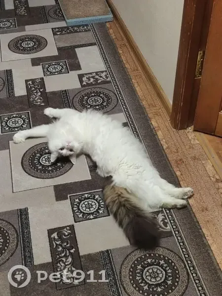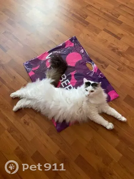Большой, белый, пушистый, чёрный хвостик, чёрное пятно на макушке, жёлтые глаза. Выпрыгнул с балкона.