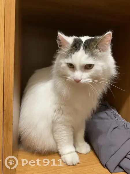 Белый, пушистый, хвост серый, на лбу два серых пятнышка. Выпал из окна 7 этажа, испугался шума детей и побежал вправо от 6 подъезда. (видели по камерам) Далее спустя несколько секунд после падения побежал на 3-4 метра вправо в закуток, где была открыта дверь магазина (склад), и больше его по камерам видно не было. Мы заходили в магазин, но сотрудники сказали нам, что не видели его.