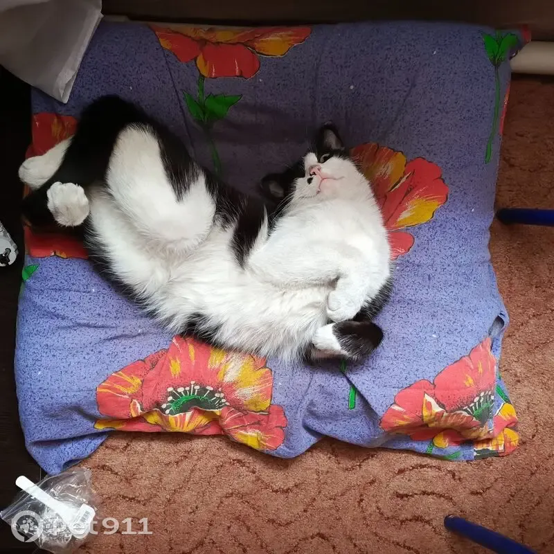 Черно белый, на мордочке пятнышко возле носа чёрное похоже на клевер. Кастрированный. Крупный более 5 кг. Пропал 13.07 в районе обеда, ушёл гулять и не вернулся по сей день