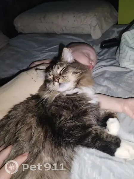 Черный с серо-белой спинкой, лапки белые, мордастый, любитель болтать, очень ласковый, откликается на имя Фурь или Кефирчик Был в синем ошейнике от блох