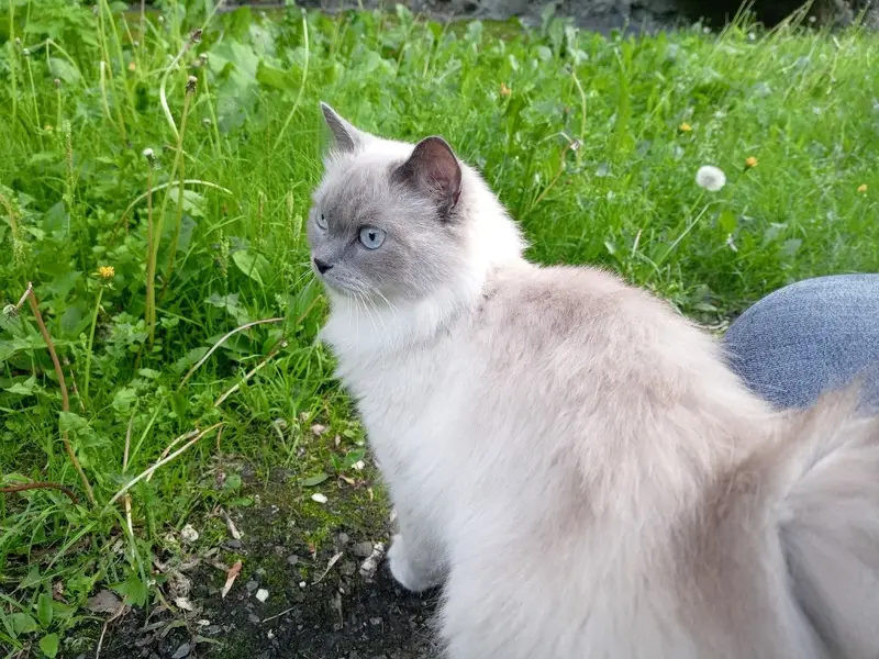 Серый кот с голубыми глазами, лапы, уши, хвост темно-серые. На нем был фиолетовый ошейник.