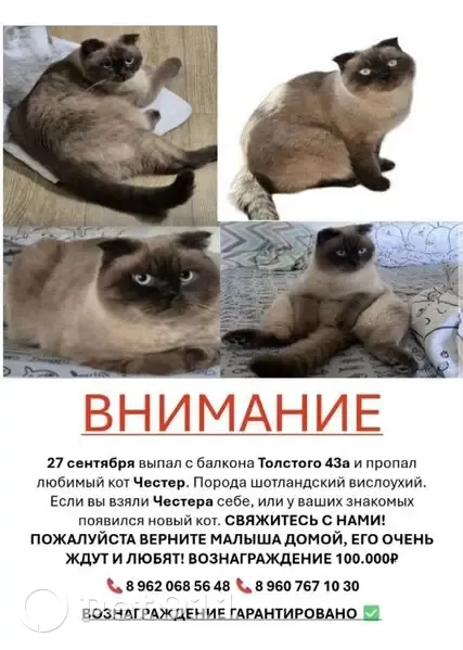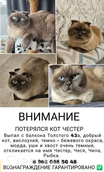 Объединено с объявлением rl1086038. Причина-дублирование информации. Описание дублирующего объявления: Шотландский вислоухий кот, голубые глаза, окрас бежевый с темными участками но морде, ушах, лапах, хвосте. Честер выпал с балкона и пропал.