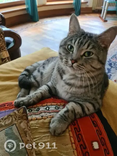 Окрас темно- и светло- серый. На теле имеются темные полоски и круги. Живем в Южном в районе Удачного. В частном доме. Кот ушел погулять и не вернулся. Раньше никогда так надолго не уходил (((