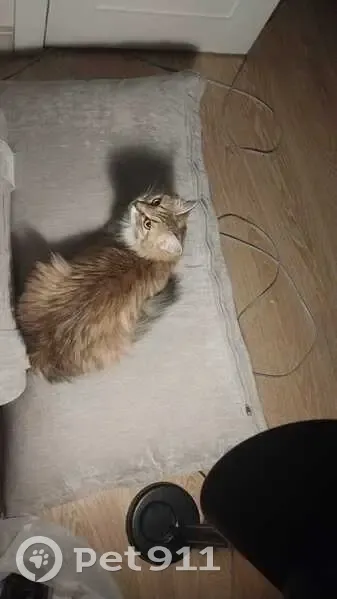 Трёхцветный окрас, спинка рыжая и на ней есть черные пятна (точки), пушистая, миниатюрная, но пушистая, если трогать хвост, то реагирует ровно и спокойно. Кожа вокруг рта, подушечки лап черные. Ночью выпрыгнула с балкона второго этажа.