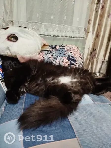 Кошечка чёрная с переливом в каштан с белым пузиком, пушистым хвостом. На левом бедре шерсть покороче,т. К сбривали при операции. На ней был одет розовый ошейник с капсулой адресником