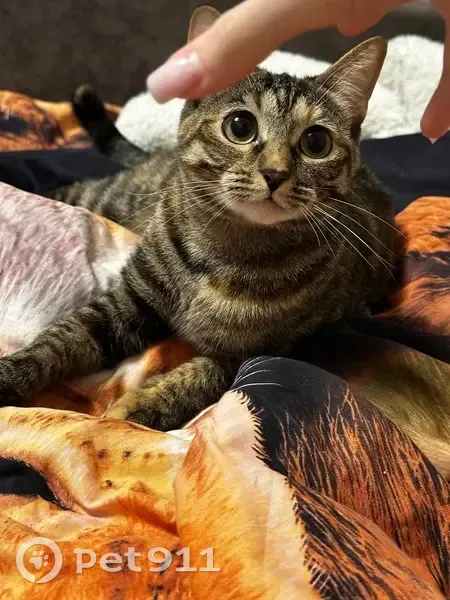 Полосатая с рыжим подтоном, одна лапка розовая, другие черные Игривая, общительная, но в стрессовой ситуации может быть максимально агрессивна. На лбу можно высмотреть букву М. Глаза зелено-желтые. Носик с розовым пятнышком Выбежала ночью и ее не заметили. Кто-то выпустил из подъезда