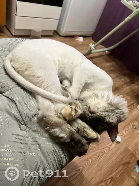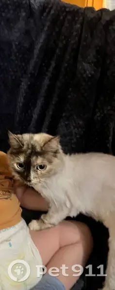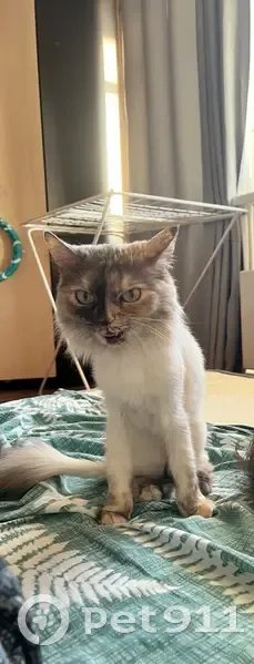 Серо белая кошка, мордочка будто поделена на 2 части, одна светлая, другая темная, подстрижена, но уже обрастает. Зеленые глаза, но хвосте кисточка. Каждая лапка(подушечки) разного окраса. Сбежала из квартиры при переезде(1подъезд)