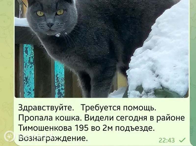Объединено с объявлением rl953932. Причина-дублирование информации. Описание дублирующего объявления: Пропала кошка 5 января 2025. Видели её 17 января в районе Водников.