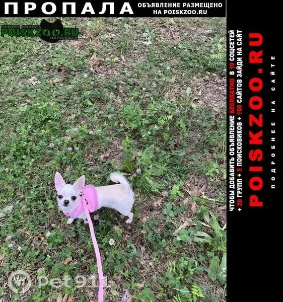 Маленькая, белая, большие уши, чихуахуа, собака не социализированная, пугливая, на животе клеймо и шрам от операции, была в голубой шлейке с черным поводком
