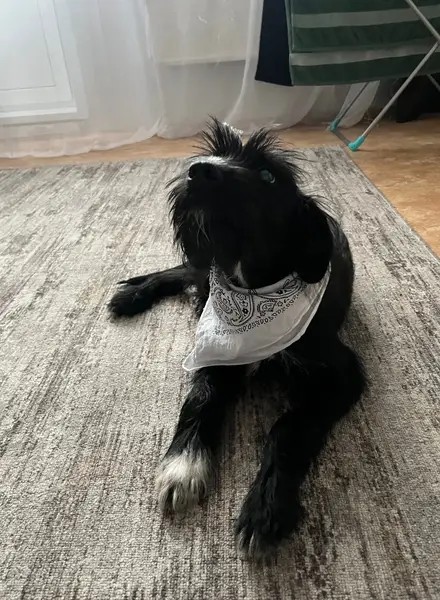Графитного цвета, длинные лапы, рост около 35-40см, откликается на имя Софа, добрая, боится чужих.