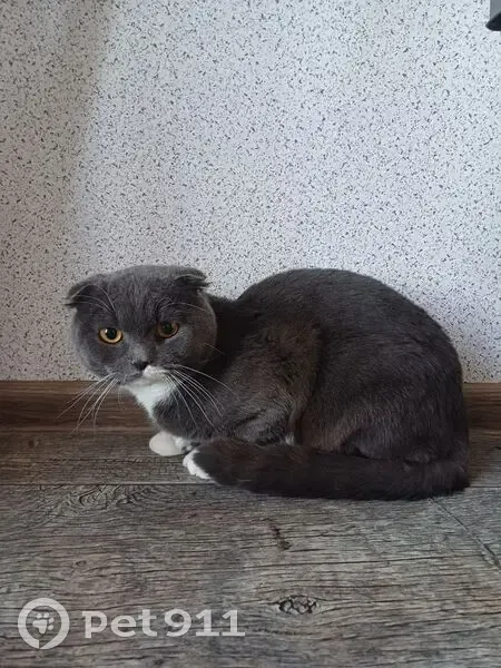 Порода - шотландская вислоухая. Котик совсем молоденький (~2 года), явно домашний, ухоженный, ласковый. Скорее всего, выбежал незаметно из квартиры и потерялся. Случайно нашли его в подъезде.