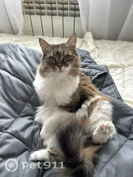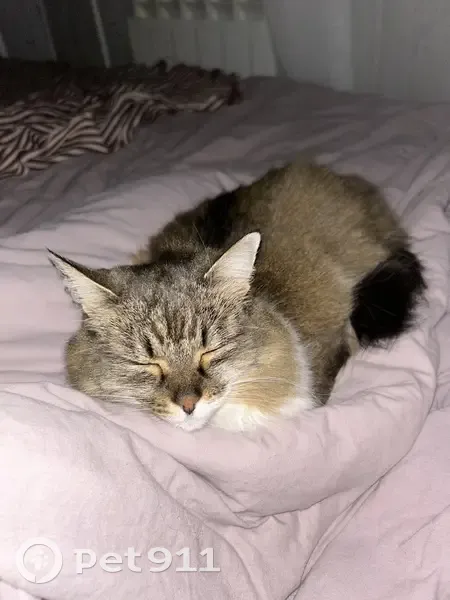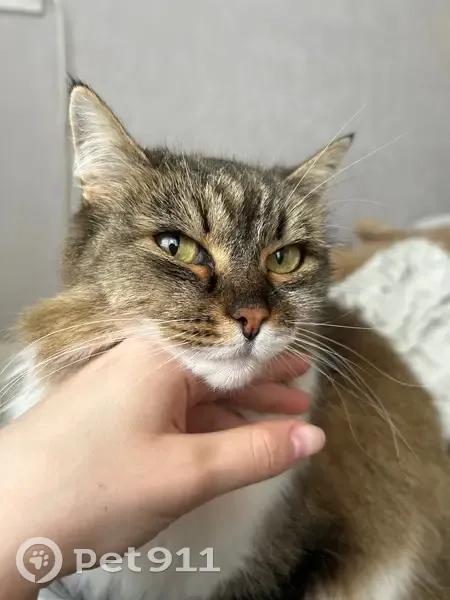Сибирская кошка, примерно 4 кг. Кличка Буся. Длинношерстная. Одна передняя лапка белая вторая полосатая с белым носочком. По спинке темпая полоса. Темный хвост.