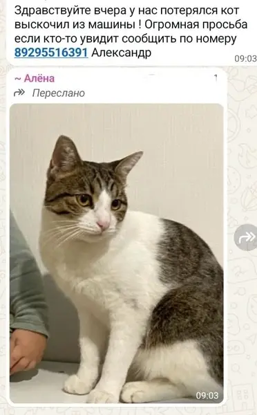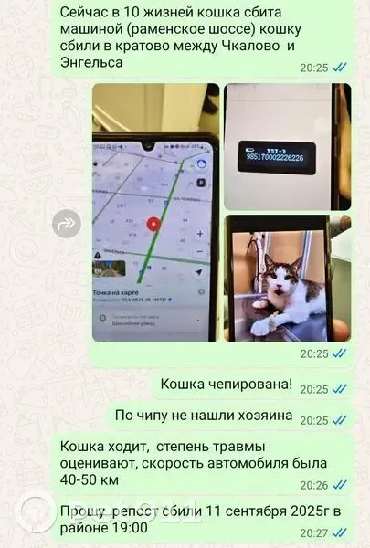 11.09.2025, 20:25 В клинике 10 жизней (Раменское ш, 51Б, Кратово, Московская обл.) кот которого сбили машиной, сбили в кратово между Чкалово и Энгельса Кот чепирован 985170002226226 Кот ходит, степень травмы оценивают (перелом нижней челюсти) скорость автомобиля была 40-50 км, сбили 11 сентября 2025г в 19:00