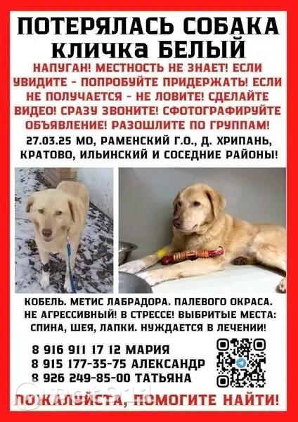 Соседи, вчера вечером (27 марта около 21:00) в деревне Хрипань в районе номерных улиц сбежал пес Белый, нужна ваша помощь!! Местности не знает совершенно. Спасен из Астрахани. Кастрированный, местами выбритый (на лечении). Без амуниции. МО, Раменский го, деревня Хрипань, Кратово, Ильинский и близлежащие районы Сейчас может быть где угодно. Распространите, пожалуйста, среди своих соседей, по разным группам и чатам. Нужна помощь по поиску на месте. Ссылка на чат поиска: https://t. Me/+ckA1sYScNa4wMGJi Напуган, не знает местности. Если увидите, не пытайтесь поймать, сразу звоните! +79169111712 Мария +79151773575 Александр +79262498500 Татьяна