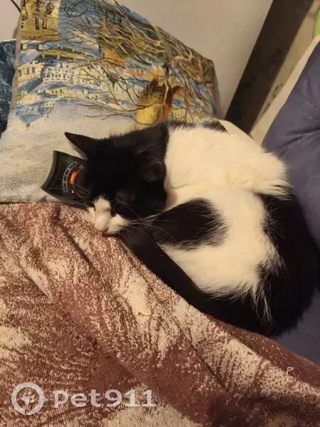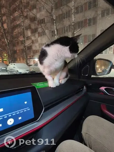 Окрас кота: белый с чёрными пятнами. Носик у него розовый, на ушах имеются небольшие залысины, на лапках заметны следы от капельницы. Животик кота побрит после УЗИ. Возможно, кот сбежал через уличную дверь на лестничную площадку, а соседи выпустили его на улицу. Кот пропал по адресу: Кронштадтское шоссе, дом 38, поезд № 4.