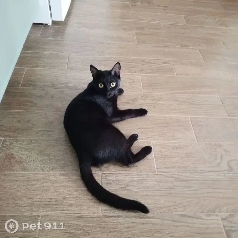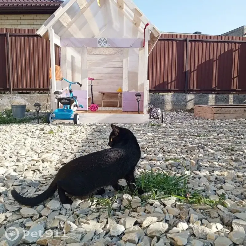 Кошка черного окраса, глаза зеленые, вытянутое тело, на шее есть белое пятнышко в виде галстука, отзывается на прозвище "Луна", домашняя, редко выходит на улицу, очень боязливая. В наше отсутствие, дверь была открыта и она выбежала.