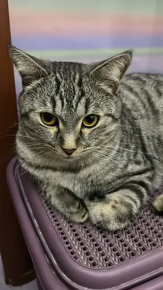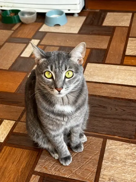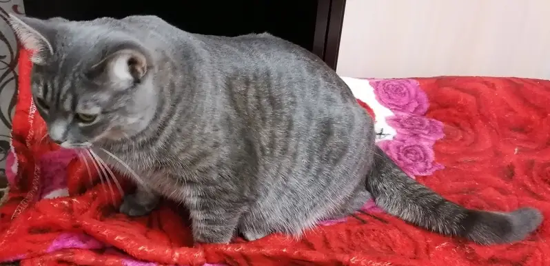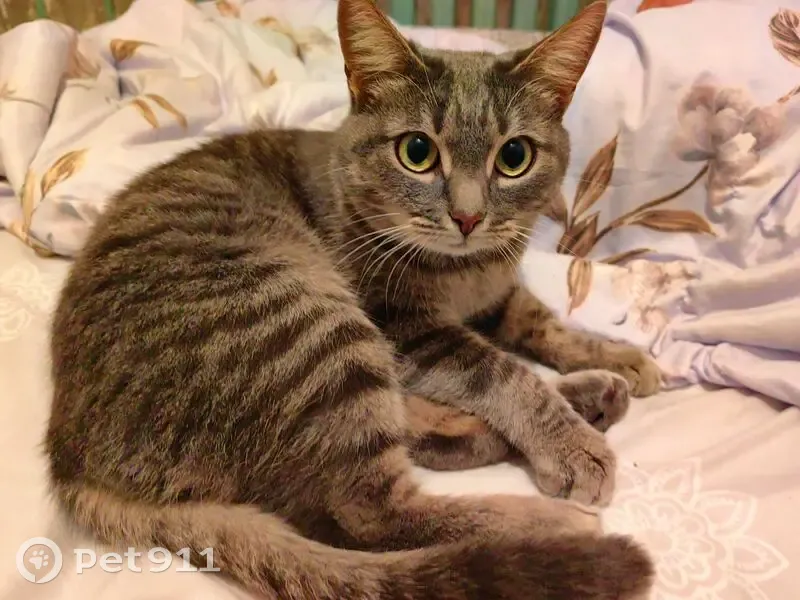 Найдена серая кошка с красным противоблошиным ошейником. Пару дней была замечена около дерева, затем люди пустили её в подъезд. Домашняя, из квартиры выходить не хочет, на улице боится и прячется. Ищем хозяев.
