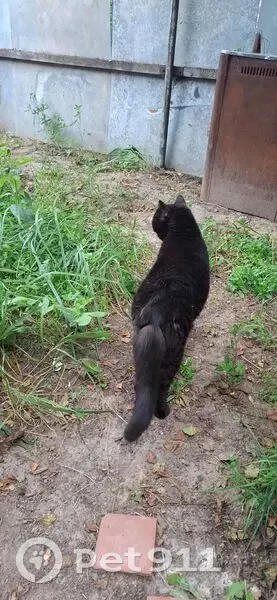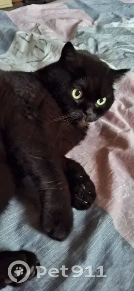 Кот Шатландец, уши прямые. Черный полностью, местами оттенок шоколадный . Кольцо возле основания хвоста без шерсти. Навряд ли пойдет на руки. Упитанный. 8 лет, взгляд яркий