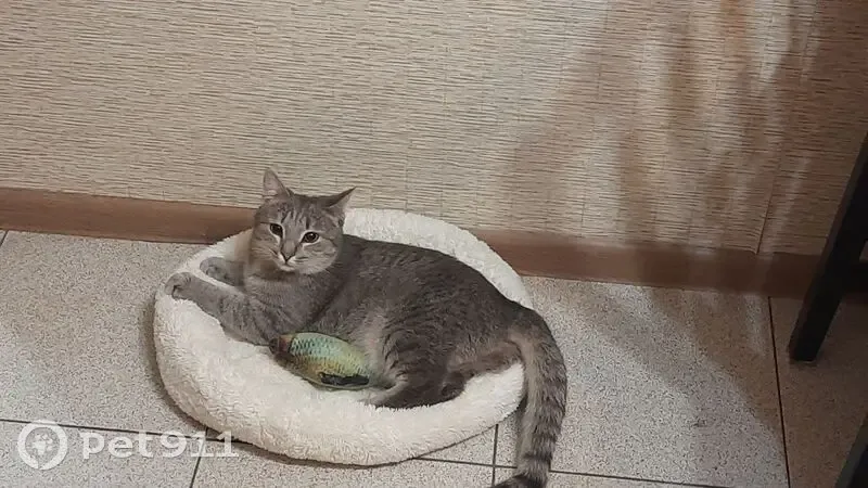 Окрас серый пятнистый, ласковая. Ходит постоянно с поднятым хвостом и кончик закручен как знак ?.Зеленые глаза. Убежала во дворе дома от испуга, сорвалась с поводка
