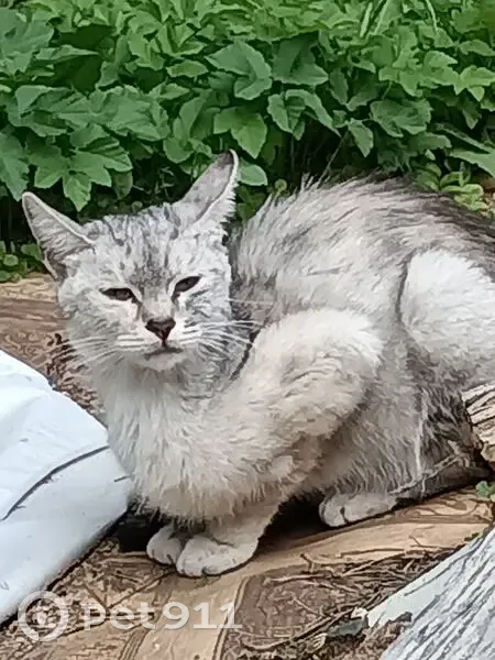 Светло-серый. Пряталась то, под машиной, то, в кустах. Не подпускает к себе ближе,чем на метр. Но, далеко тоже не убегает. Была очень голодная. Истощена. На еду выходит. Но, потом опять отбегает. Раньше среди местных котов не замечали. Похожа на домашнюю.