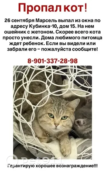 Пропал кот, кличка Марсель, окрас серый полосатый, был в ошейнике с жетоном, ошейник металлический. Не пугливый. Потерялся по адресу Кубинка-10, дом 15.Если вы его взяли/приютили – прошу, сообщите! Я обеспечу хорошее вознаграждение.