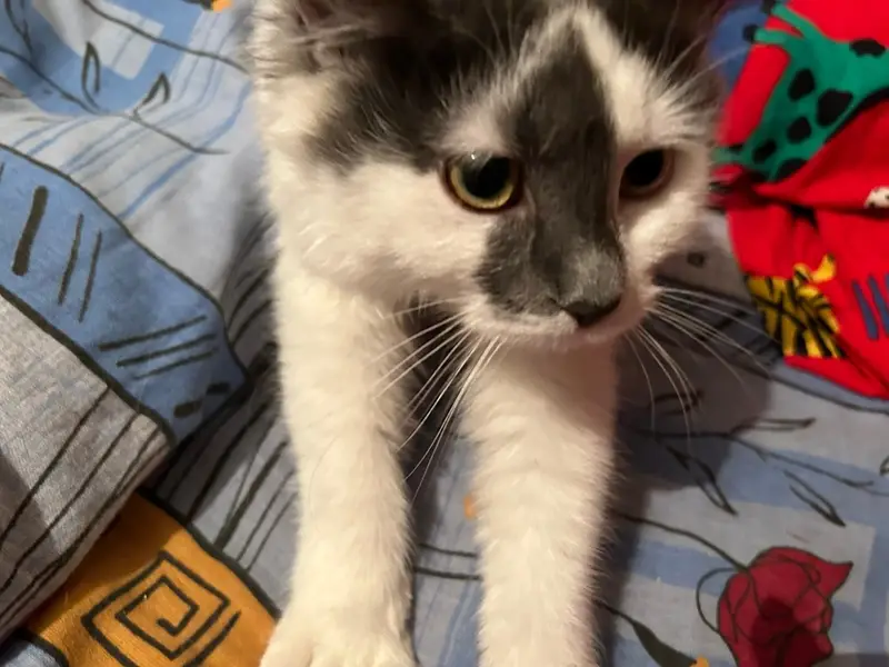 Белая кошечка, с черным хвостом и частично мордочкой. Кошечку сводила к ветеринару, она судя по всему беременная. На контакт пошла сразу, спокойно сидит на руках.