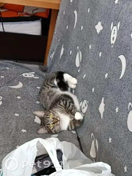 Маленькая и очень пугливая, не контактная, выскользнула вечером из квартиры Ей около года или чуть меньше, на груди белый воротничок, сама она в полосочку