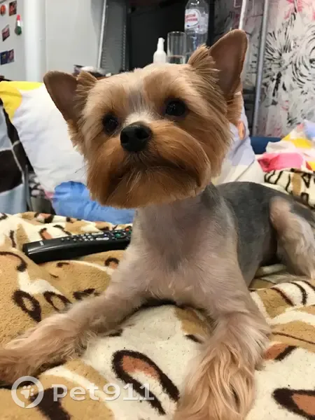 Йоркширский терьер рыжий спина серая, хвост крючком, на горле шрам небольшой, игривый, любит мячик, палочку. Человекоориентированный . Может сейчас напуган!
