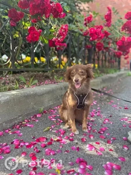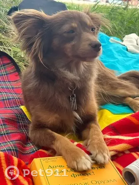 Коричневая шерсть средней длины, светлые лапки и грудка, пятнышки на мордочке. Одно ушко висит, а другое стоит. Очень недоверчивая и пугливая, приютская, но на контакт может пойти. Убежала во время пожарной тревоги в доме, может где-то прятаться.