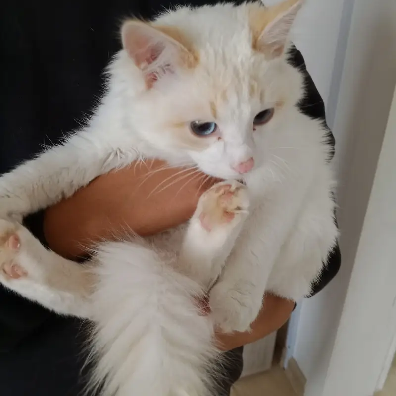 Белый пушистый взрослый кот. Два года. Рыженький хвост, рыжие пятна на голове и большое рыжее пятно в районе кресца, глаза жёлтые. К чужим может не подходить, собак сторонится