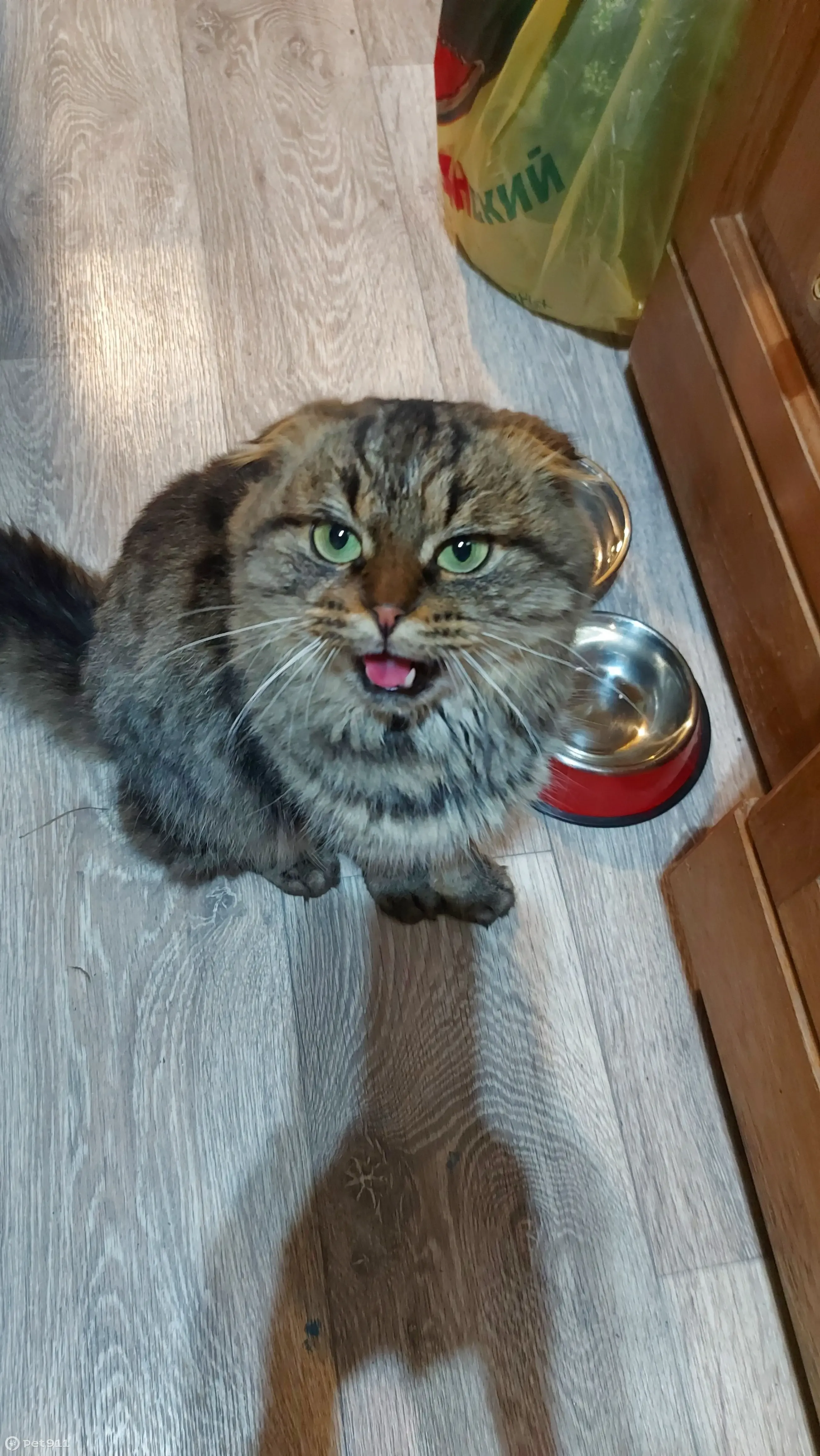 Найден кот. Полосатый, очень пушистый хвост, желто-зеленые глаза, вислоухий. Разговорчивый. В дом сам зашёл, явно домашний и контактный. Ищем хозяев (отдадим только с подтверждением фотографиями питомца).