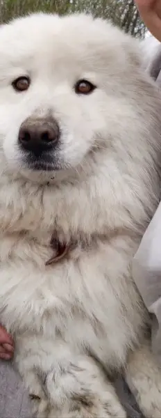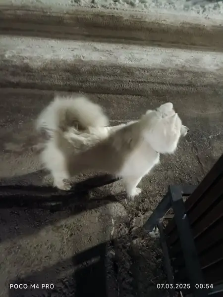 Красивая молодая собака белого окраса. Похожа на Самоеда. Очень ласковая. Домашняя или бывшедомашняя. Ищем старых или новых хозяев.
