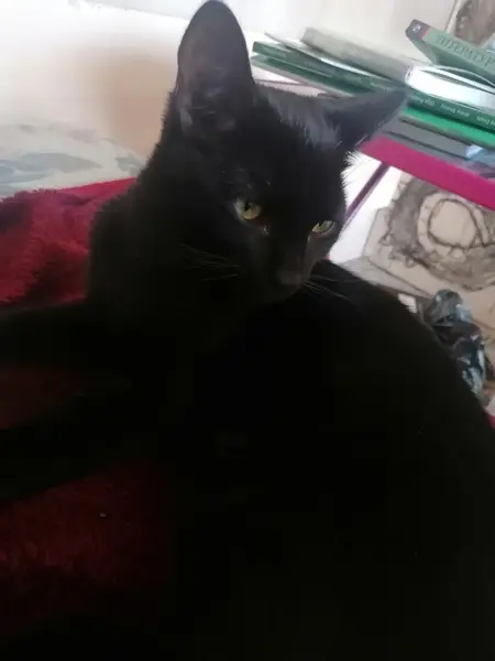 Большой черный кот , на груди небольшая белая отметина. Белая отметина на животе между задними лапами. Жёлтый ошейник. Неделю сидел в подвале, сегодня зашёл в подъезд.