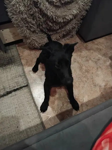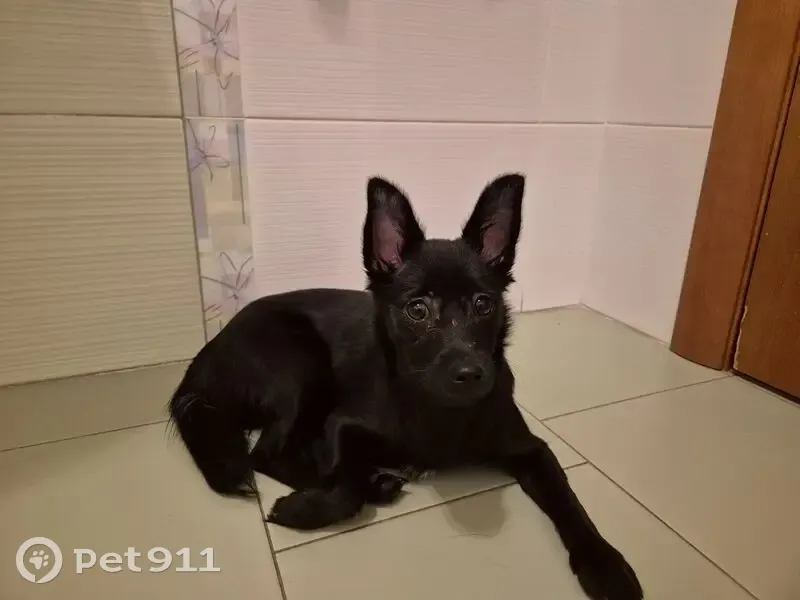 Молодая, мелкая чёрная с узкой белой полоской на груди, боязливая,домашняя.