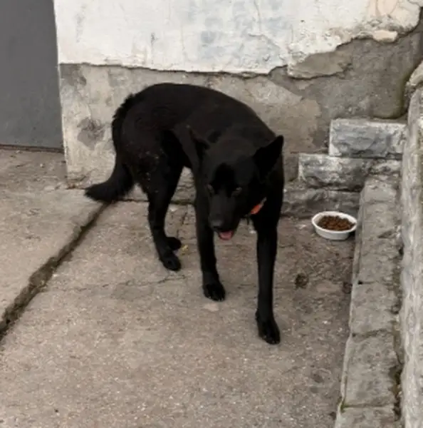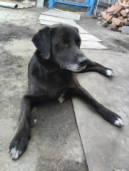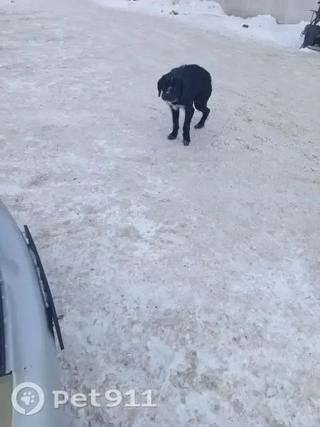 Находится на утяке,окрас черный с белым,крупный кобель в ошейнике.