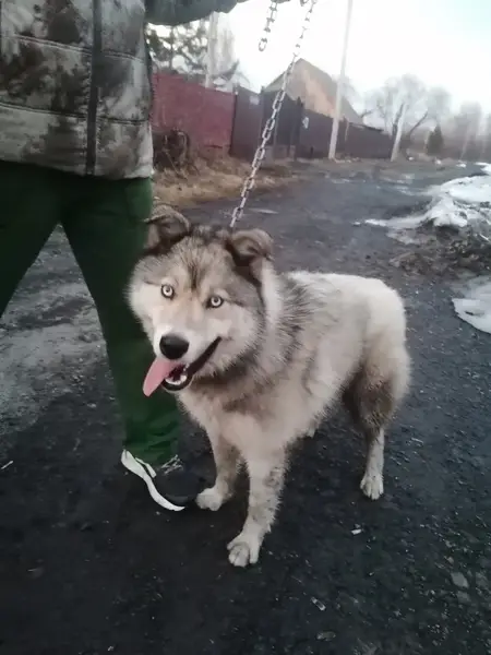 Хаски, вроде молоденький песик, бегал по дороге, чуть под машину не попал. В микрорайоне Глинки