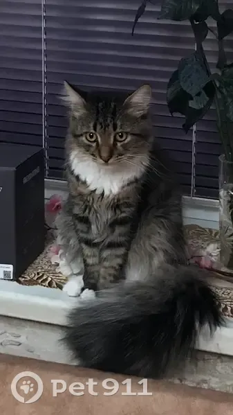 Окрас серый, белые лапки и белый воротничок, длинношёрстный. Особая примета: очень пушистый хвост. Бояздливый. 5.06.25г. В 21:30 вырвался с поводка и забежал в заросли на перекрёстке ул. Гоголя - ул. Половинская (напротив церкви через дорогу)