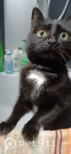 небольшого размера, чёрная , с белой грудкой и животом, возможно хромает. Могла испугаться собак на улице и убежать, спрятаться где нибудь, возможно забежала к кому то в дом или на участок