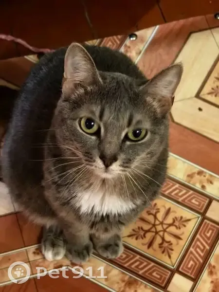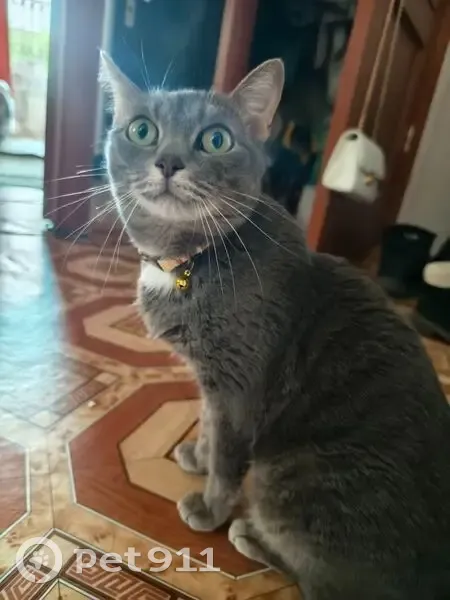 Цвет серый, белая «манишка» на грудке, на шее – желтый ошейник с бубенчиком. Пугливый. Вышел на козырек окна и выпал, при попытке забрать с улицы - испугался и убежал.
