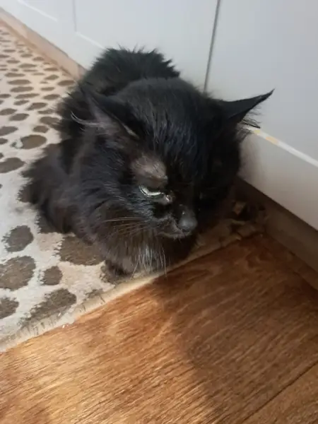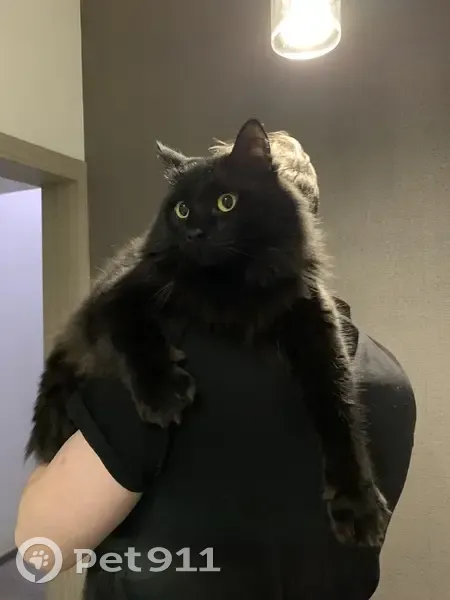 Большой и очень пушистый полностью черный кот. Упитанный, но за дни скитаний мог сильно похудеть. Убежал, когда приехал в дом в СНТ «Радуга» на передержку.