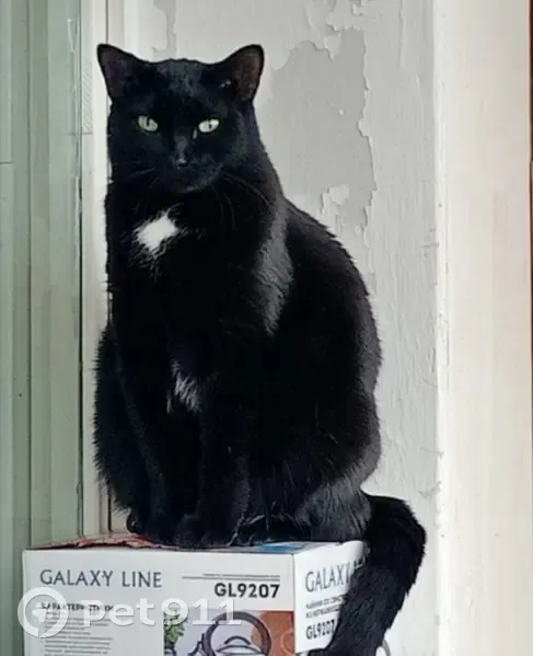 Окрас чёрный, гладкошерстный, глаза зеленые, на шее снизу, на грудке, в подмышках и внизу живота белые пятна.