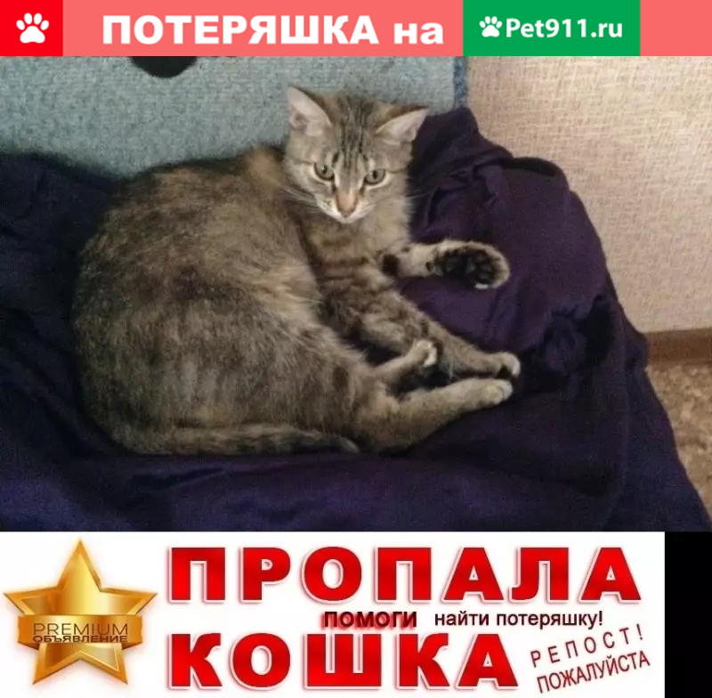 Потерянные животные Курган, фото: Пропала кошка в Кургане, р-н Половинская, 8-б. Помогите найти!