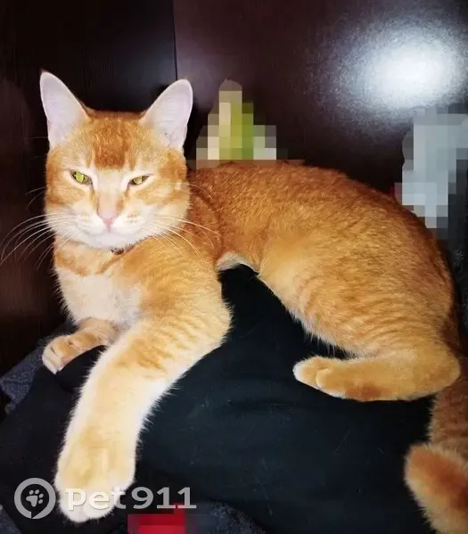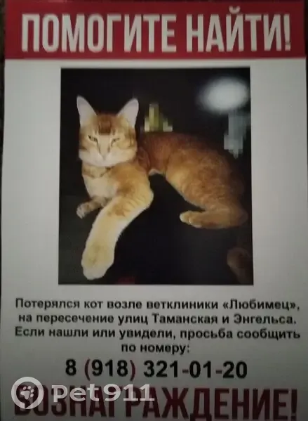 Ярко Рыжий в мелкую полоску с большими глазами, мог быть в декоративном ошейнике с подвесками. Остерегается чужих людей, боится шума машин. Сорвался с поводка после приёма врача и убежал